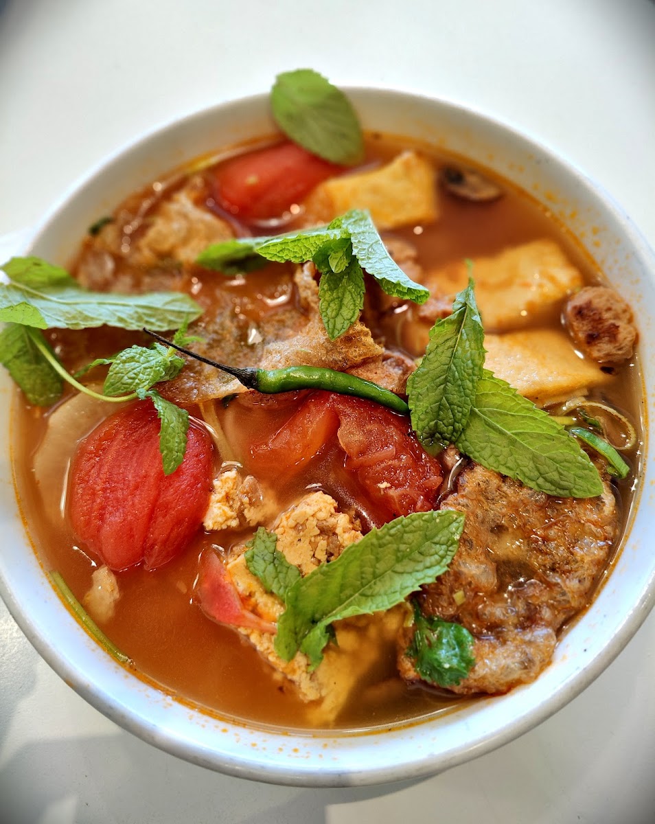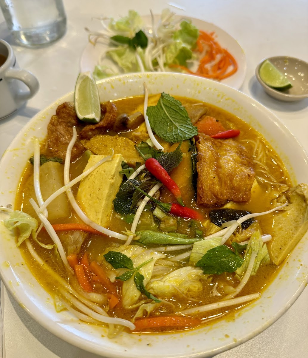 A standout on the menu is the Bún Riêu Tomato Bean Curd Noodle Soup, a comforting bowl that bursts with rich tomato flavor balanced by soft, silky bean curd. It’s the kind of dish that warms you from the first spoonful, and the combination of noodles, herbs, and broth makes it an instant favorite among both regulars and newcomers. Another highlight is the 43 Curry Noodle Soup, where aromatic spices create a delicate yet deeply satisfying curry base that pairs beautifully with tender tofu. For fans of classic Vietnamese flavors, the 10 Vegan Pho delivers a fragrant and hearty experience, filled with fresh herbs and perfectly cooked noodles that feel authentic and fresh with every bite.